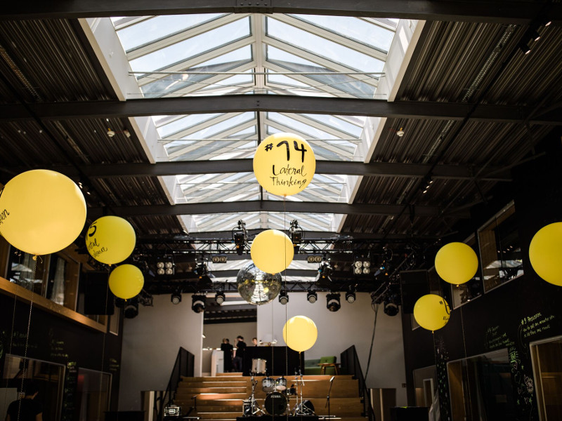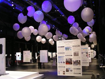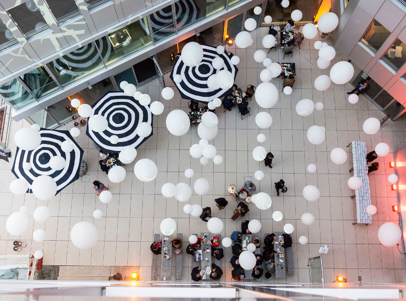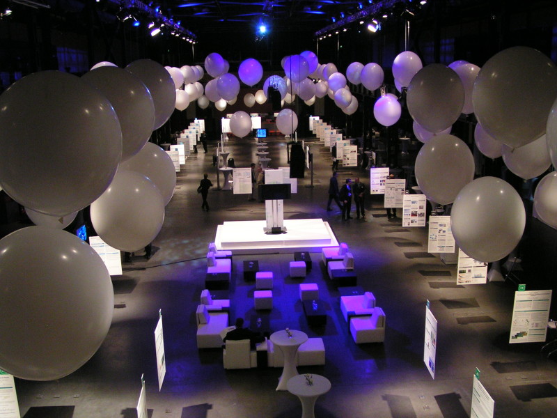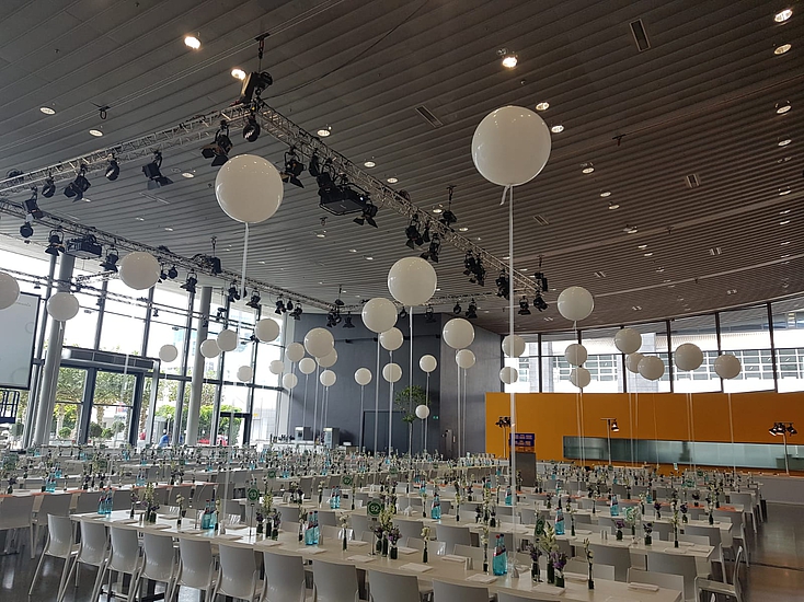 Zur Dekoration großer Festsäle finden wir kreative Lösungen mit schwebenden Heliumballons, die ein großes Raumvolumen optimal in Szene setzen.