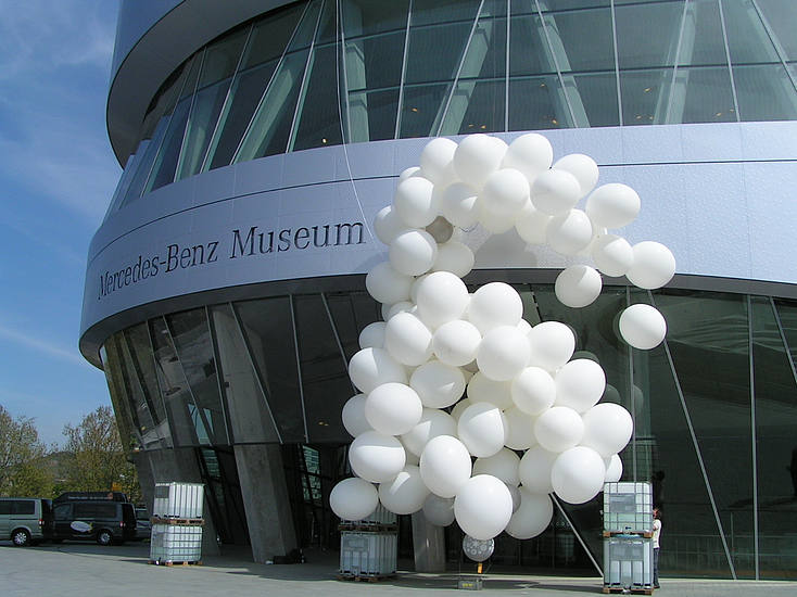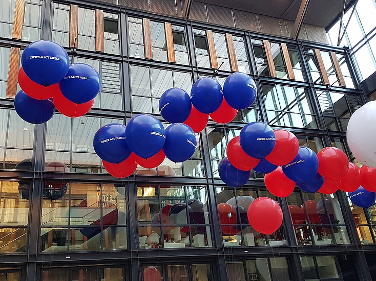 Vielfältige Ballon-Arrangements und besondere Raumdekoration (Tischdekoration, Dekoration des Eingangsbereichs) zählen zu unserem Portfolie genauso wie die Installation von Riesenballons schwebend über Festzelten oder Autohäusern.